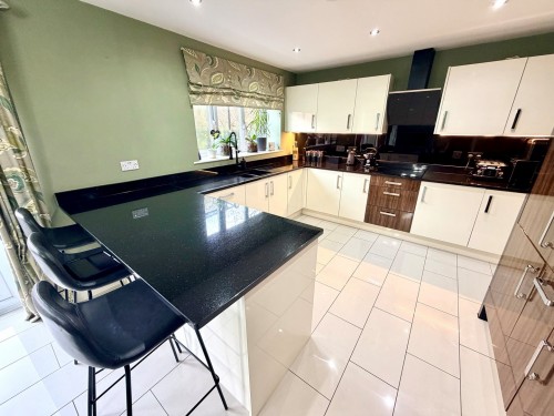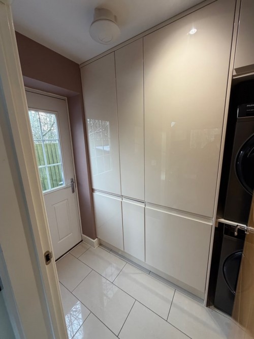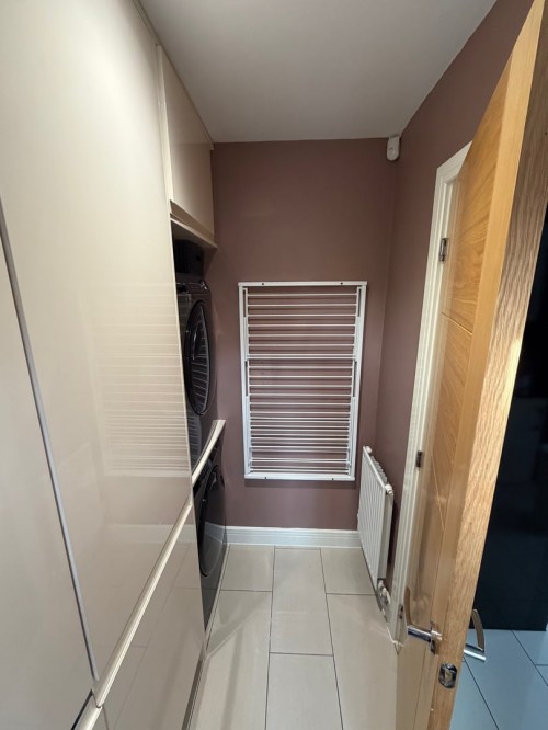 2.2m x 1.5m (7' 3" x 4' 11") A practical addition with matching high-gloss fitted units, plumbing for a washing machine, integrated full-height fridge, clothes airer, ceramic tiled flooring, radiator, downlighting and a door providing further access to the rear garden.
