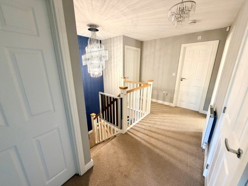 A half-galleried landing with radiator and airing cupboard, providing access to a partially boarded loft space.