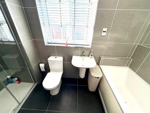 2.9m x 1.7m (9' 6" x 5' 7") Fully tiled with ceramic tiled flooring, heated towel rail and downlighting. Comprising a full-size panelled bath, separate shower enclosure with dual-head shower, wall-hung wash hand basin and low-flush WC.