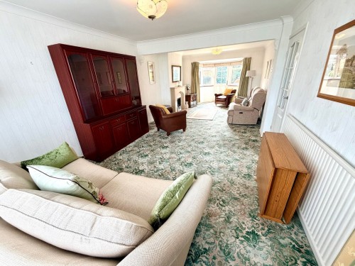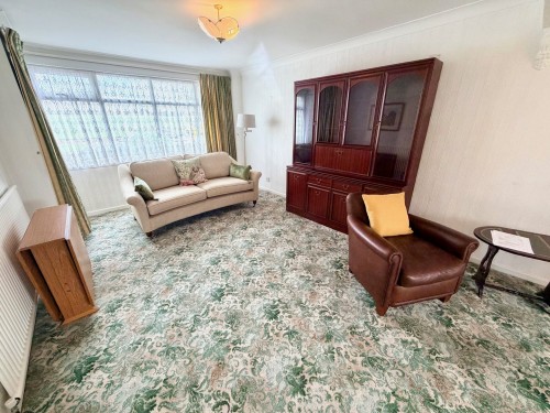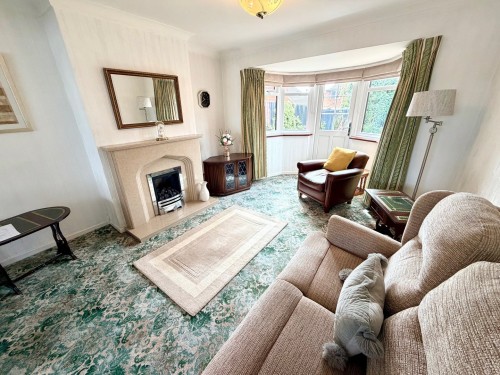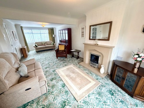3.4m x 8.6m (11' 2" x 28' 3") Window to front, radiator, feature fireplace with flame effect gas fire and French door to rear garden.
