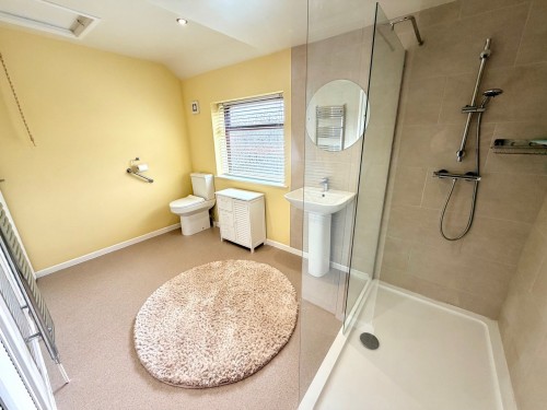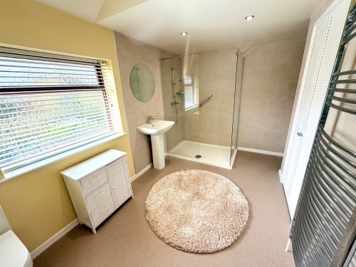 3.7m x 2.1m (12' 2" x 6' 11") max. Shower enclosure with Mira electric shower unit, low flush wc, pedestal wash hand basin, heated towel rail and airing cupboard with central heating boiler.