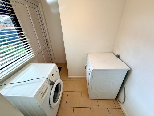 1.8m x 2.1m (5' 11" x 6' 11") Plumbing for washing machine,ceramic tiled floor, window to side, door to rear garden and separate wc.