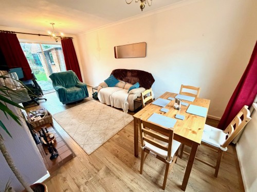 3.3m x 6.1m (10' 10" x 20' 0") Window to front, radiator, patio door leading to the rear garden, laminate floor and feature open fireplace with log burner.