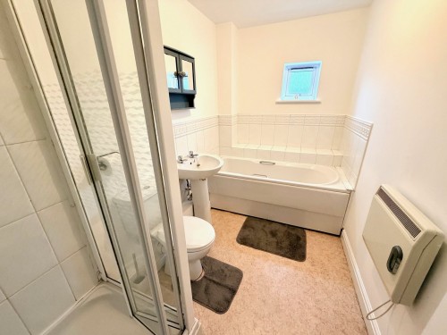 1.7m x 3.1m (5' 7" x 10' 2") Wall mounted electric panel heater and white suite comprising, panelled bath, low flush wc, pedestal wash hand basin and separate shower cubicle with Triton electric shower unit.