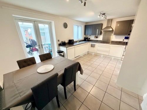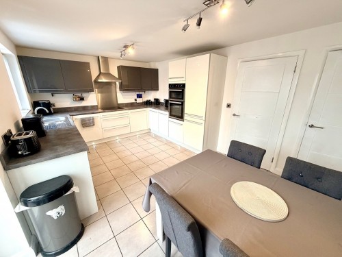 5.2m x 3.3m (17' 1" x 10' 10") Hving a range of wall and base cupboards with a gloss white finish and plinth lighting, matching work surfaces incorporating a stainless steel sink unit, built in eye level oven with separate grill, electric induction hob. overhead extractor, integrated fridge freezer, ceramic tiled floor, radiator, window to rear, large under stairs cupboard and French doors leading to the conservatory.
