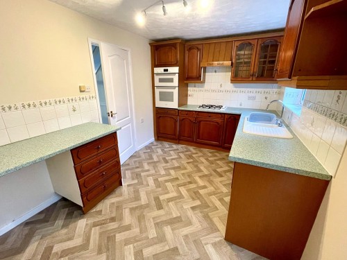 2.60m x 4.29m (8' 6" x 14' 1") With a range of wall and base cupboards having matching work surfaces incorporating a one and a half bowl sink unit with drainer and mixer tap, splash back tiling, built in double oven, separate gas hob, overhead extractor, radiator, breakfast bar, window to rear and door to conservatory.