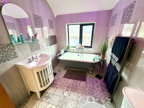 2.6m x 3.1m (8' 6" x 10' 2") Being fully tiled to all exposed walls with integrated TV, free standing Victorian style bath, vanity unit with wash hand basin, shower enclosure with rainfall shower head, heated towel rail, ceramic tiled floor and down lighting.