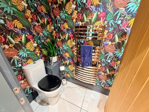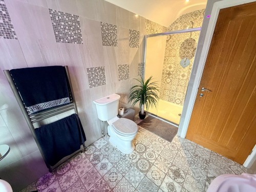 Low flush wc, wash hand basin, down lighting, ceramic tiled floor and heated towel rail.