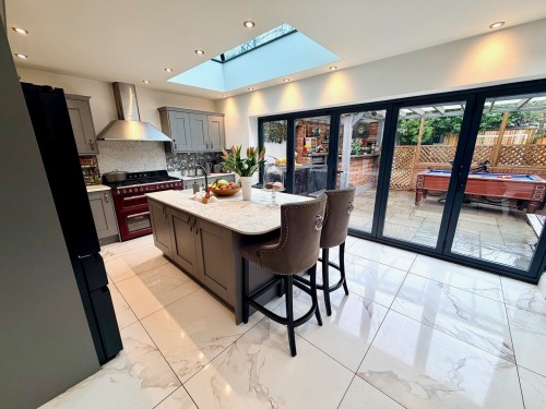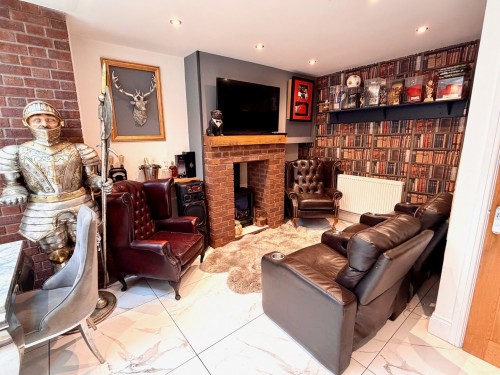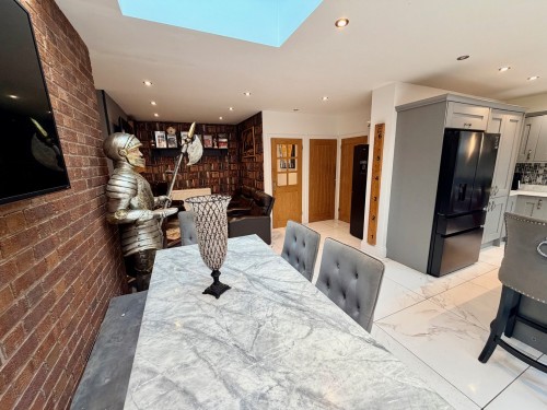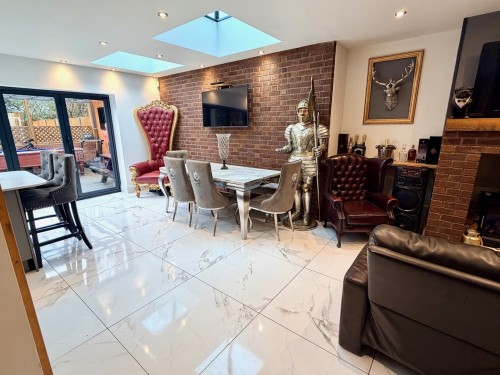 6.3m x 7.9m (20' 8" x 25' 11") Having Aitrium roof and a comprehensive range of fashionable wall and base cupboards with quartz work surfaces, island having quartz work surfaces incorporating a Belfast style sink and cupboard space below, down lighting, under floor heating ,ceramic tiled floor, chimney style overhead extractor, feature brick fireplace with flame effect log burner and Bifold doors leading to the rear garden.