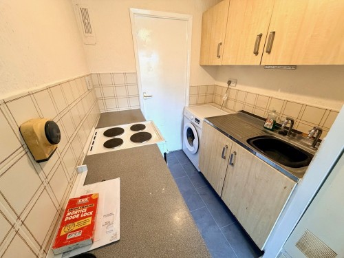 1.7m x 2.0m (5' 7" x 6' 7") Wall and base cupboards, work surfaces incorporating stainless steel sink unit, splash back tiling and plumbing for washing machine.