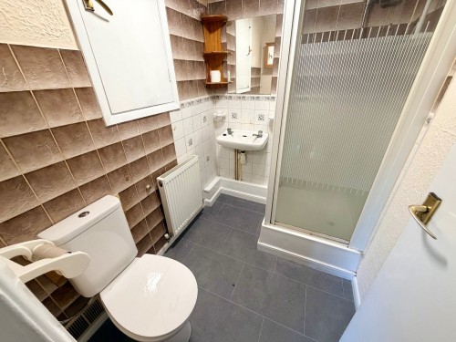 Shower enclosure, low flush wc, wash hand basin, radiator and airing cupboard with central heating boiler.