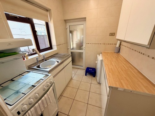 1.9m x 2.2m (6' 3" x 7' 3") Being fully tiled to all exposed wall, wall and base cupboars, matching work surfaces, stainless steel sink unit, gas cooker point, window to side, ceramic tiled floor and door to utility room.