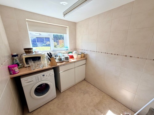 1.8m x 2.4m (5' 11" x 7' 10") Fully tiled to all exposed walls, base unit, work surface, plumbing for washing machine, window to rear and side door to rear garden.