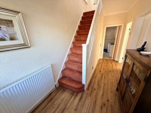 Having stairs off, radiator, laminate floor and under stairs storage.