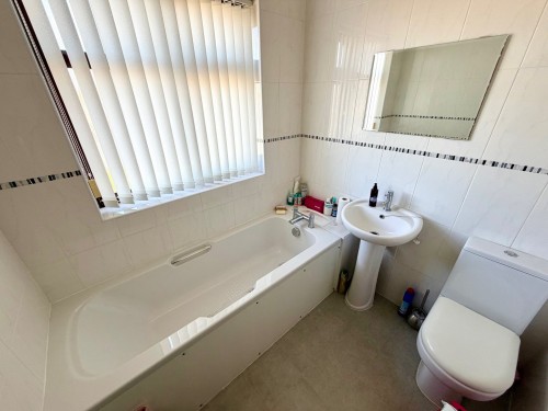 ||Being fully tiled to all exposed walls, heated towel rail and white suite comprising, panelled bath, pedestal wash hand basin and low flush wc.