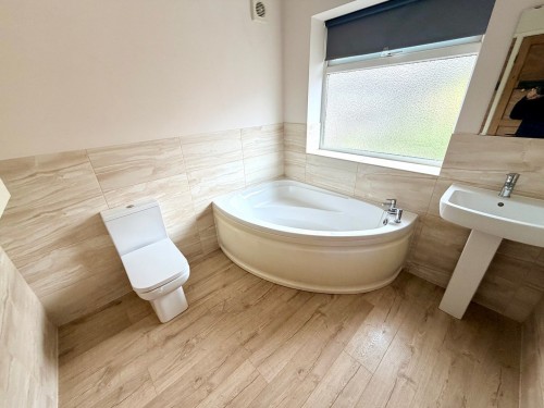 2.2m x 2.3m (7' 3" x 7' 7") Laminate floor, heated towel rail, corner bath, pedestal wash hand basin and low flush wc.