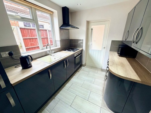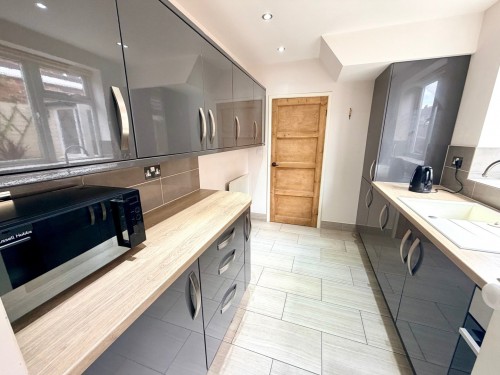 2.2m x 2.9m (7' 3" x 9' 6") Having a range of fashionable wall and base cupboards with matching work surfaces incorporating sink unit and mixer tap, built in oven, gas hob, overhead extractor, integrated fridge, down lighting, window to side, ceramic tiled floor, radiator, central heating boiler and door to rear lobby.