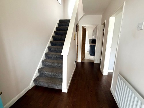 Laminate floor, stairs off, radiator and under stairs cupboard